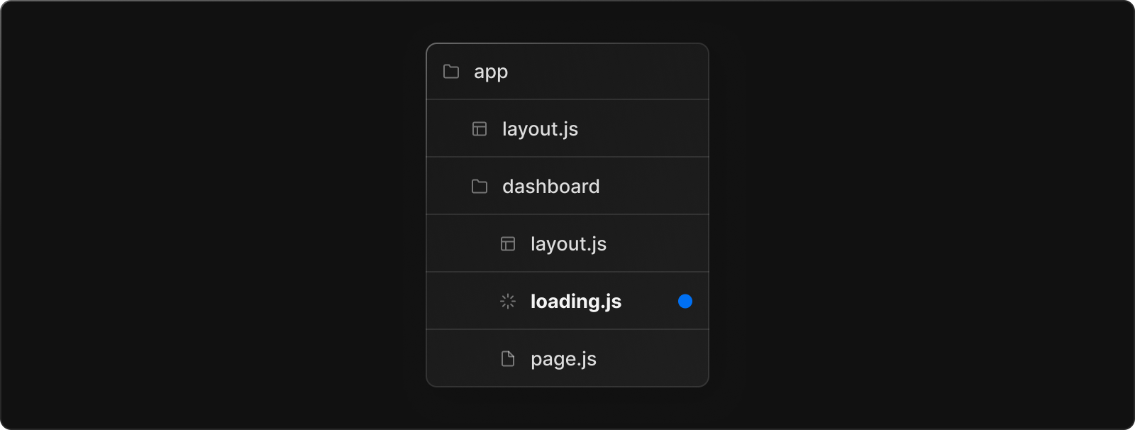 layout.js, page.js를 포함한 아래 jsx파일들은 전부 Suspense로 래핑 되게 되어 loading 될 때까지 loading.js이 반환하는 Element를 렌더링 하게 된다.
