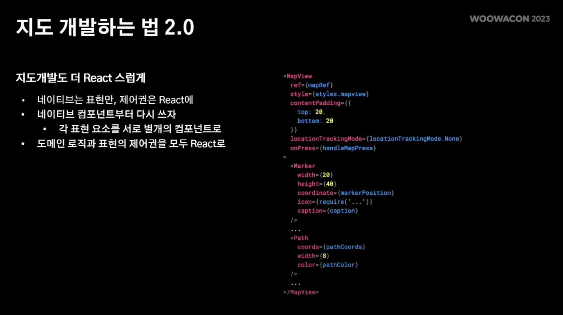 배민 커넥트는 좀 더 자세한 지도를 제공하기 위해 국내 지도를 사용했고, 이를 위해서는 각각 네이티브 코드가 필요한 상황이라고 한다.
