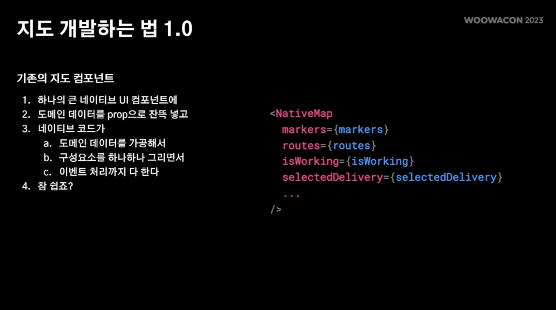 그래서 기존에는 지도에 필요한 도메인 데이터를 싹다 props로 집어넣고 네이티브 코드가 가공해 사용했다고 한다.